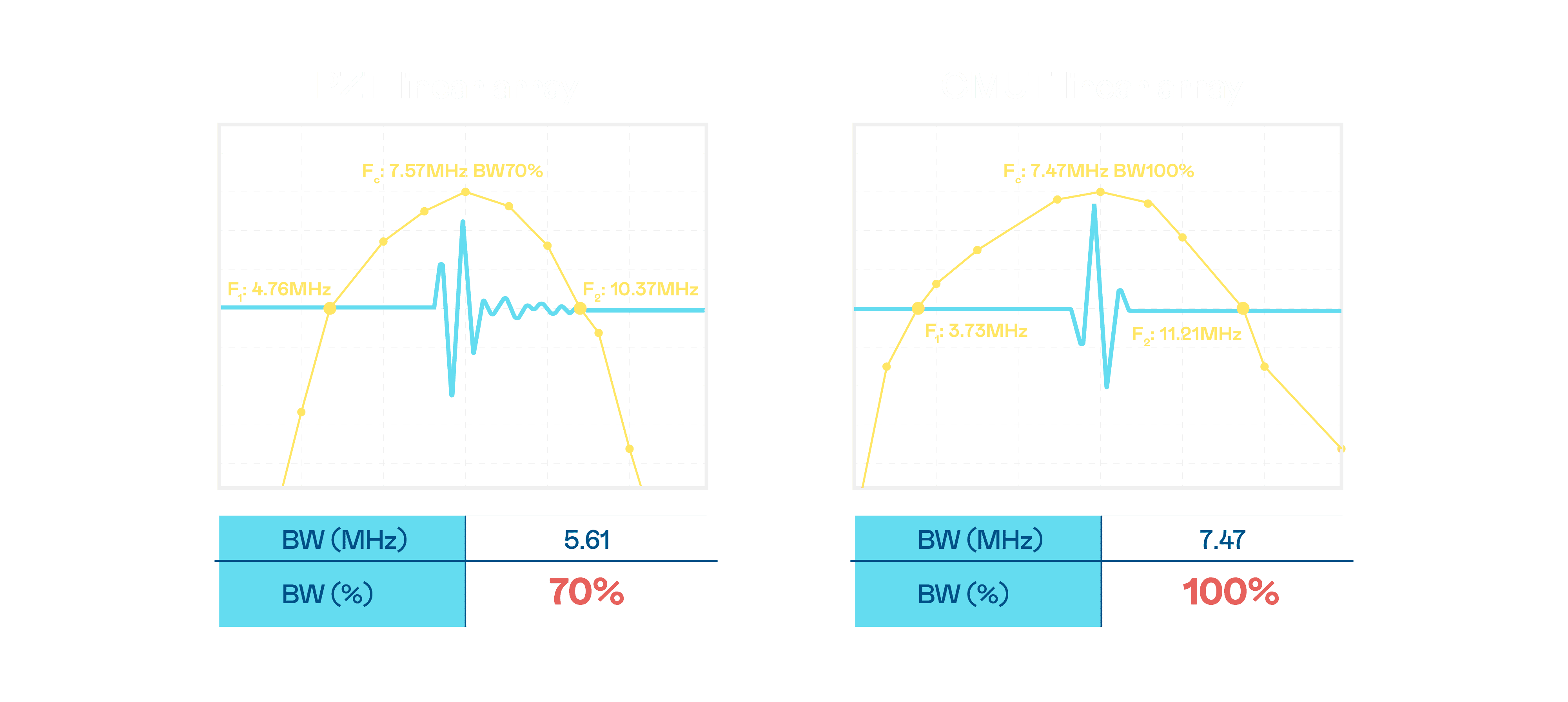 超音波影像的解析度高低,,首先取决于探头能发出的讯号频宽。。冰球突破 CMUT 可提供高清晰的超音波讯号,,,提供高频宽、、、、高灵敏度、、、影像纹理细节更高的超音波影像,,协助医护人员缩短影像判读时间及利用精准的医疗影像进行诊断。。。。